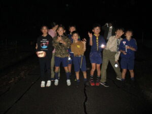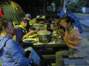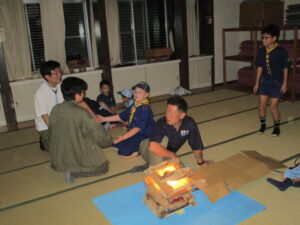 10月4日(土)、5日(日)土子原こども野外広場で、21団団キャンプを行いました。両日とも生憎の雨模様で、活動に支障はありましたが、ほぼ計画道理の内容で、ビーバー、カブ、ボーイみんなが参加することができました。設営は屋根の下で行い、濡れないようにしました。夕食作りは先日カブのくスカウトデイキャンプで習ったカレーライスです。キャンプファイヤーは雨のため、室内で行いました。各隊の出し物と、ゲームやソングを楽しみました。その後、ボーイとカブはコワーイ夜間ハイクもありました。2日目も雨の中、全隊で追跡ハイキングに出かけました。ポイントではゲームやクイズに答え、優秀組を目指しました。雨の中のキャンプでしたが、思い出に残る充実したキャンプとなりました。