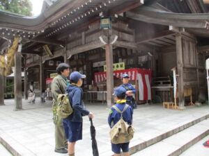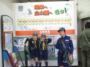 10月19日(日)カブ隊は、ミサ、教会レクリエーションの後、秋の電車のたびに出かけました。今回のコースです。【広坂教会ー野町駅ー鶴来駅ー加賀一の宮駅跡―白山比咩神社表参道ー白山比咩神社―ほうらいの杜(獅子頭ワールド)ー金剱宮ー鶴来駅―野町駅ー広坂教会】でした。かなり長距離歩くコースでしたが、スカウトは頑張りました。気温は寒く、天気は1日中曇り。ハイキングには良かったのかどうか?