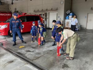 9月21日(日)カブ隊は泉本町中央消防署に見学に行きました。消化器での消火訓練、はしご車搭乗、司令室見学など、楽しく消防について学びました。消防署の皆さんありがとうございました。